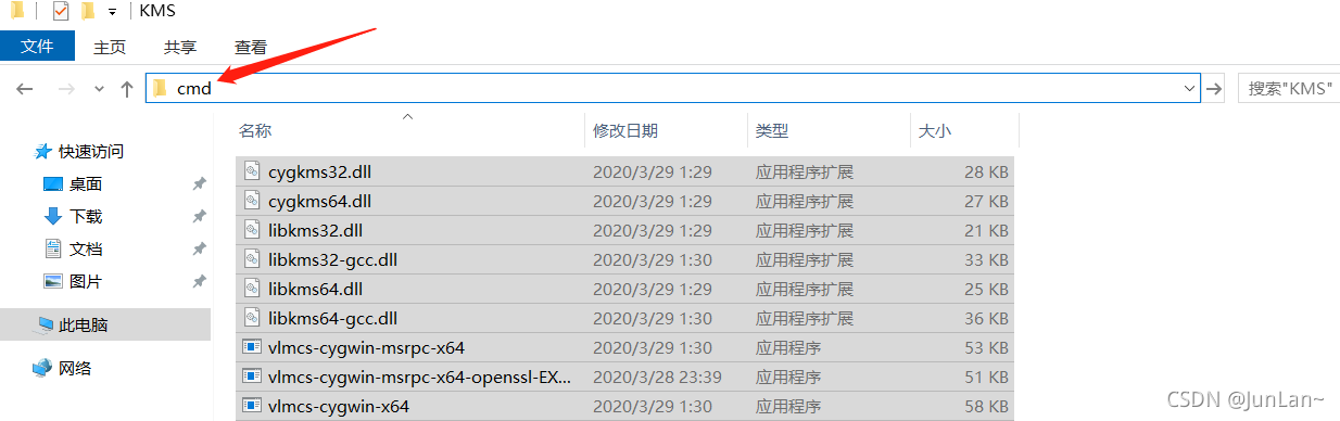 4、在C:\KMS目录下直接运行CMD,注意运行是管理员权限